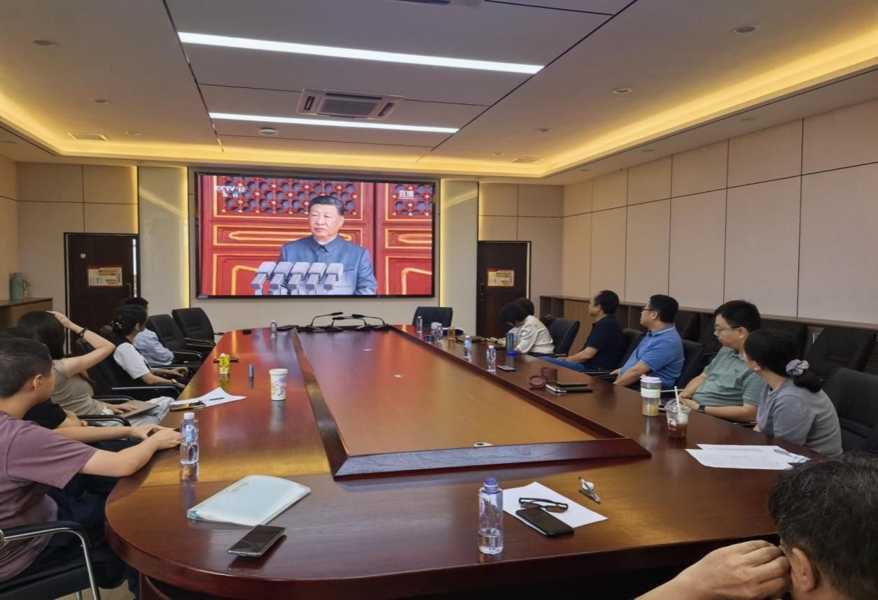 会议室气氛庄重而热烈,当庄严的国歌奏响,所有人员整齐肃立,饱含着对祖国的热爱和对先烈的缅怀之情。随后,大家一同聆听习近平总书记的重要讲话,观看了盛大的阅兵仪式。这次阅兵,是全面推进中国式现代化进入新征程的首次阅兵,是人民军队奋进建军百年的崭新亮相,是中华民族捍卫和平正义的坚定宣示。