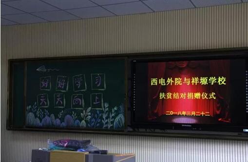 在捐赠仪式过程中,党委书记杨跃首先发表讲话,他说,扶贫工作应从国情教育出发,落到实处是关键。他提出加强外院教师、学生与祥塬学校的交流,一方面通过利用我们的专业特长来帮助祥塬学校,一方面使我们的老师同学也接受一场生动的思想政治教育,把扶贫转化为一场对等的心与心的交流,把扶贫做出层次,实实在在地帮助祥塬学校的老师和孩子们走得更好、更远。