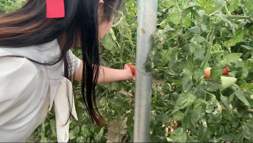 成员们共同考察了红色旅游与现代农业融合发展的生动缩影—安吴堡陕西翠芳洲绿色农业发展有限公司。在农耕文化体验馆,同学们亲手操作纺车、研磨稻谷,一件件农具浓缩着中国农耕文化的发展积淀,也凝聚了古代劳动人民的勤劳与智慧。在果蔬大棚,同学们体验采摘西红柿的乐趣,兴奋地讨论各地农村的新发展、新变化。公司负责人张成全详尽介绍了依托红色文化与现代采摘农业相结合建立休闲农业的思路与进展,使同学们亲身领略到田园之恋与绿水青山的美好共生,也深切感受到了新时代农村产业与时俱进的发展活力,这正是红色乡村居民对美好生活的真切追求与映照。恰如安吴村史馆前所题,"留得住青山绿水,记得住乡愁"。乡愁就是你离开了这个地方,你就会想念。