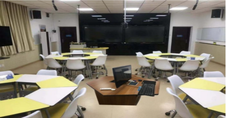 □中心研讨型——兼顾授课与研讨,教师讲桌居于中心位置,改变传统教师角色,拉近师生距离。适合分组展示,促进互动交流。