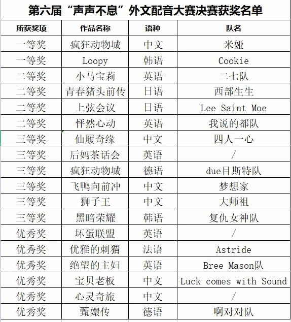 经过现场综合评定,获奖名单依次揭晓。韩语配音团队cookie和来自土库曼斯坦的留学生中文配音团队米娅勇夺一等奖,二七队等四个团队获得二等奖,四人一心等团队获得三等奖。大师祖队获最佳人气奖。
