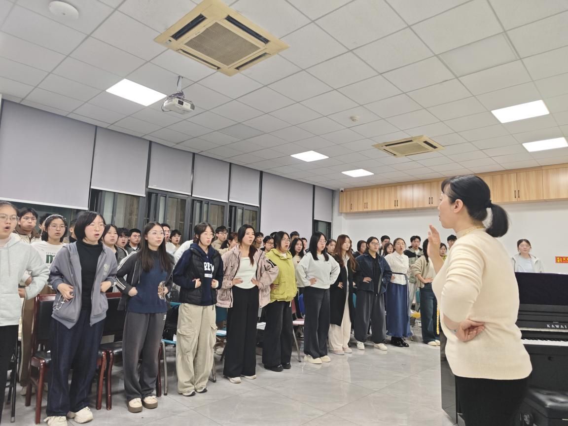 排练现场,指导老师带领队员们扎实开展基础训练:先完成男女生分声部划分,再通过气息、节奏、音阶及面部发力专项练习夯实演唱基础,随后转入歌谱唱法专项训练。每次排练前都会进行系统的开嗓训练,确保同学们以准确饱满的状态投入曲目练习,之后再逐句打磨歌曲的旋律与情感。