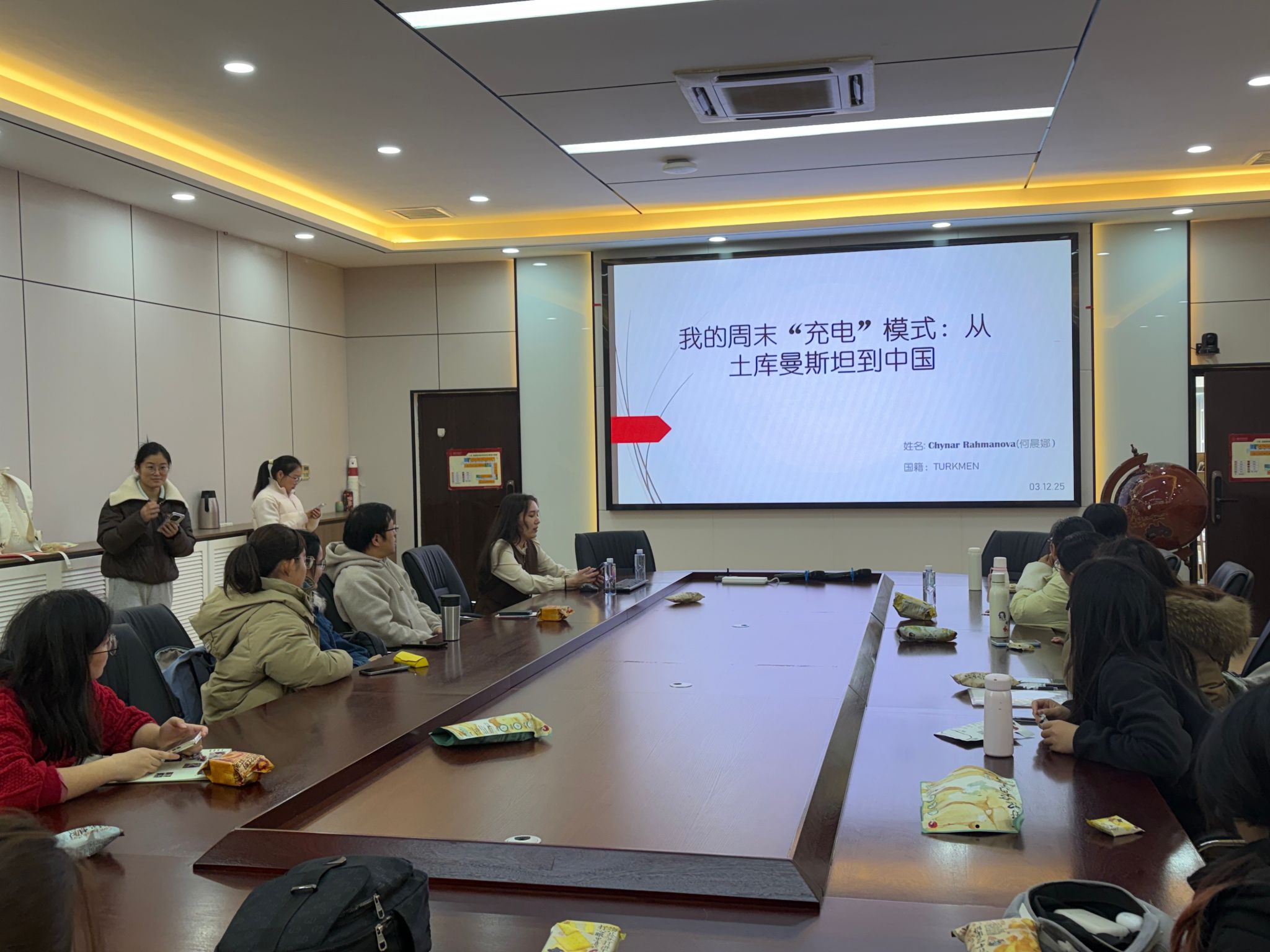 随后,备受期待的学生分享环节精彩上演。中外学子带着各自的 “娱乐故事” 依次登台,呈现了一场丰富多元的文化盛宴。中国学子赵文博以流畅的日语展开分享,细致讲述了听音乐放松、追剧、玩电子游戏等周末日常,生动的描述让在场国际学子直观感受到中国青年现代娱乐生活的多彩与便捷。来自土库曼斯坦的 RAHMANOVA CBYNAR(何晨娜)则用中文分享了家乡独特的娱乐场景:土库曼斯坦实行 “单休制度”,人们仅周日休息,周六需正常上学或工作;她还重点介绍了自己最爱的 “打人球” 游戏,其玩法与中国的 “丢沙包” 颇为相似,引发了在场学子的强烈共鸣。此外,多名中国学生用英语补充分享了多元的周末选择:有人沉迷剧本杀,在角色代入与逻辑推理中享受社交乐趣;有人钟情书法,在笔墨挥洒间感受传统文化的沉静力量;还有人热衷摄影旅行,用镜头定格城市街巷与自然风光。这些丰富多样的娱乐方式,让国际学子对中国青年的生活态度有了更立体、全面的认知。