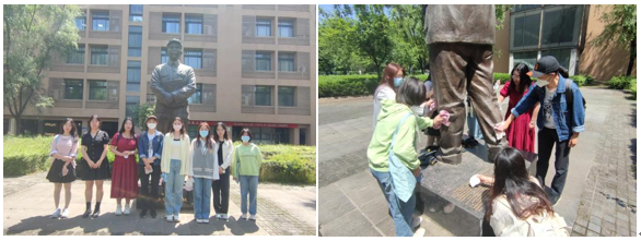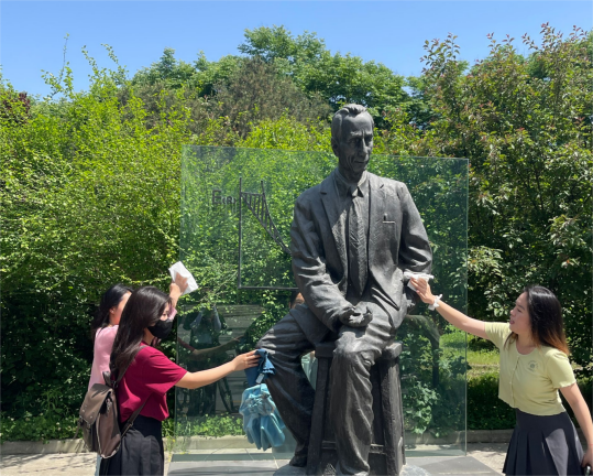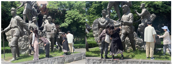 学习了相关校史文化后,院实践部的成员将大家分为三个小组并分别带队前往信远楼、大学生网络文化安全工作室和图书馆,对其附近的校史雕塑进行清洁。