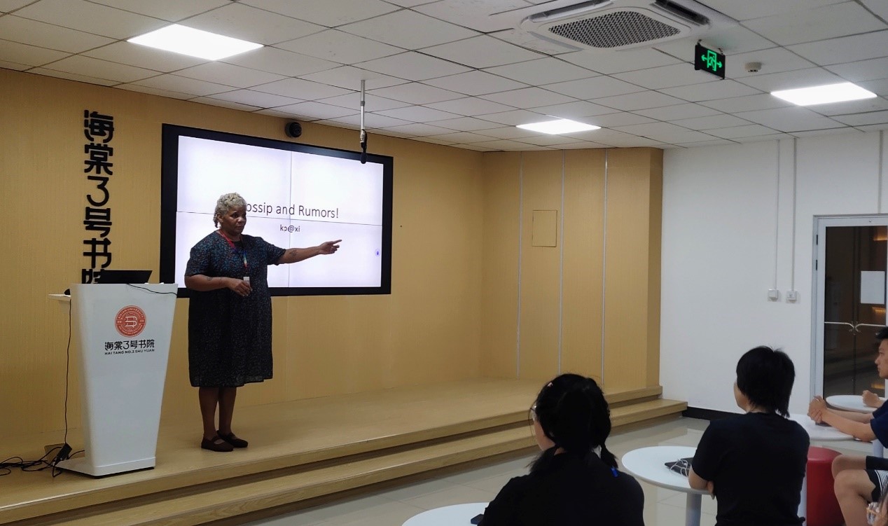 讲座开始,Kenya Pressley首先从英文词汇中“Gossip”的各种含义和用法入手,即中文含义中的“流言蜚语”,让同学们对“Gossip”有了更加明确的认识。随后,她通过案例、小组活动等多种方式生动形象地阐述了“Gossip”对个人、团体和社会的负面影响。提醒同学们不要轻信、传播或制造虚假信息,并强调信任、公正、善良等正确价值观的重要性。