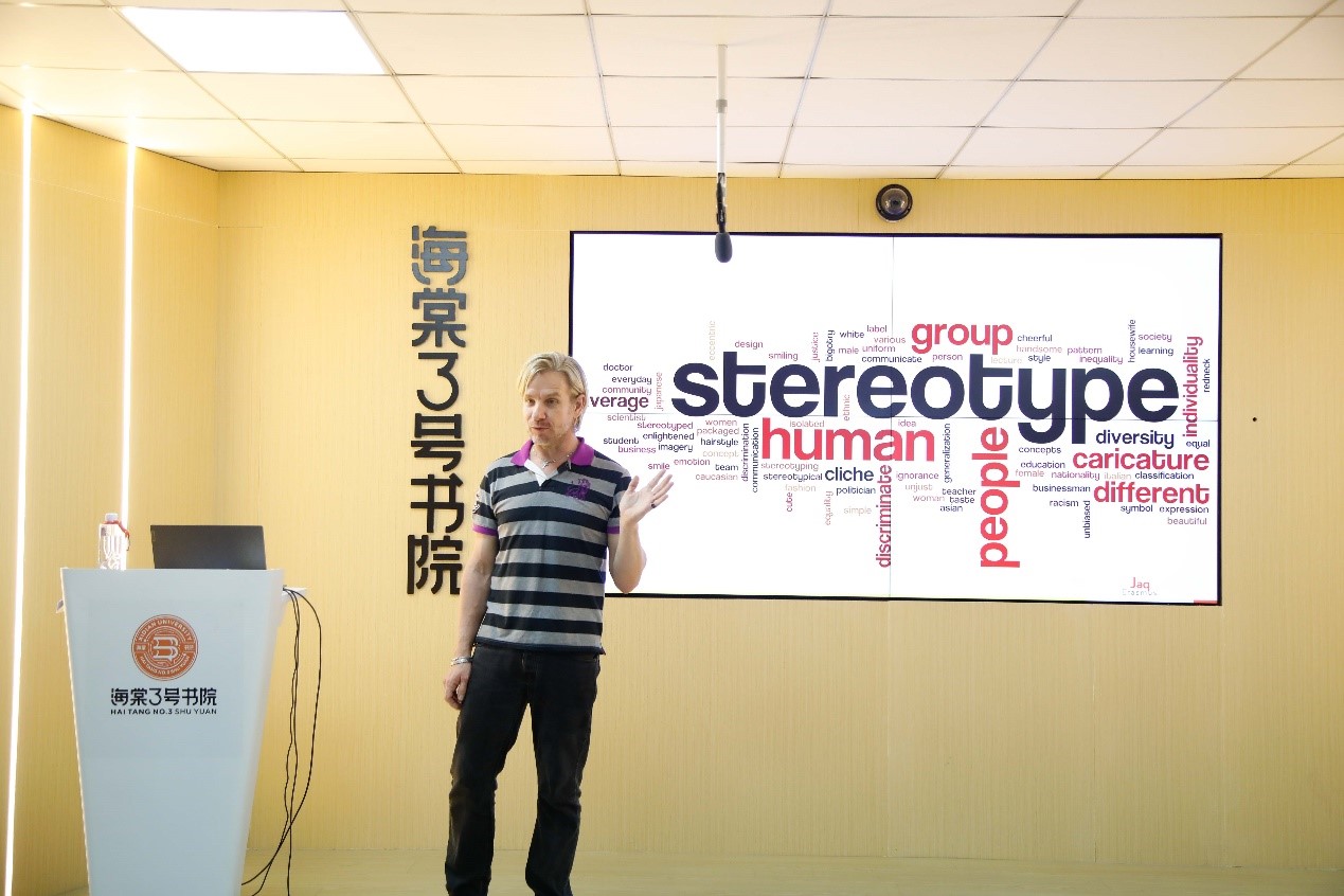 Jaq Erasmus先为同学们解读了“Stereotype”的概念和含义。随后,指导学生自由结成小组进行小组讨论,第一个讨论的主题是“对中国的刻板印象”,并辨析这些印象的正确与否;第二个讨论的主题是“对其他国家的刻板印象”,展示在中国人眼中也同样存在的刻板印象。在同学们的发言结束后,他表达了自己作为一名曾在多个国家教学的英语教师对这个话题的深度思考和独到见解。他强调,人们对于种族、性别、身份等方面的刻板印象会造成社会中的负面影响,鼓励学生们摆脱模式思维,认真思考并去除自己的潜意识中存在的偏见。