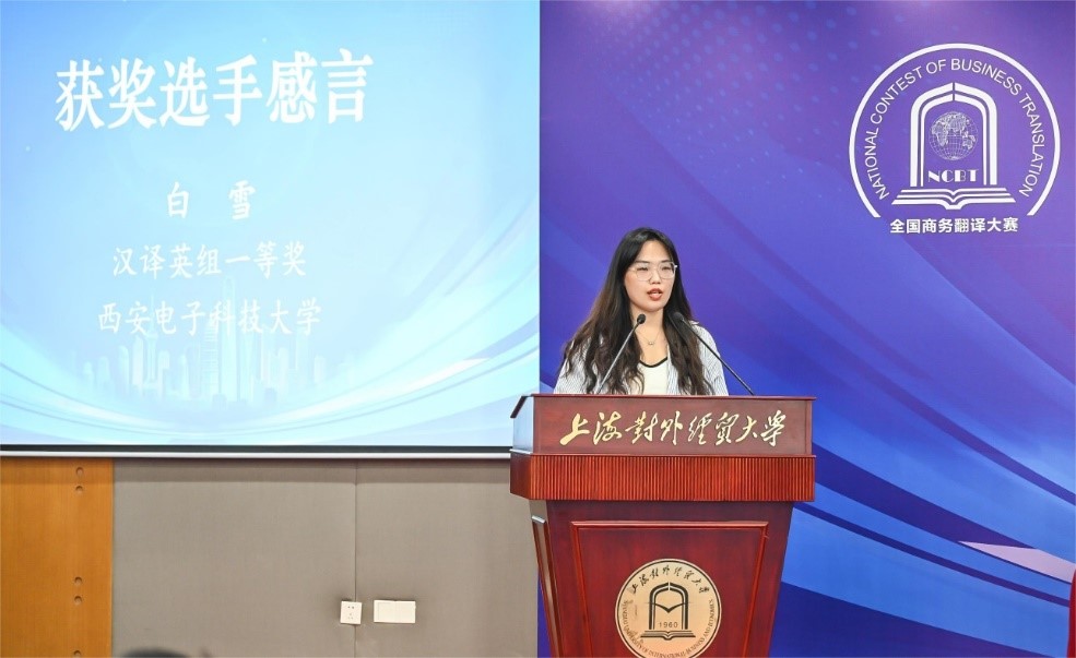 白雪同学能在全国众多参赛选手中脱颖而出,是乐竞官网平台翻译人才培养质量的体现。她在发言中说,“讲好中国故事,传播好中国声音,提升我国国际传播能力是新时代外语人义不容辞的使命与担当。”她对学校重视MTI专业学位点建设表示感谢,认为西电乐竞官网平台在着力培养高层次、应用型翻译人才方面有方法、有举措、有成效。其发言展现了西电外院学子强烈的使命感和扎实的专业素养,得到了在场嘉宾的高度认可。