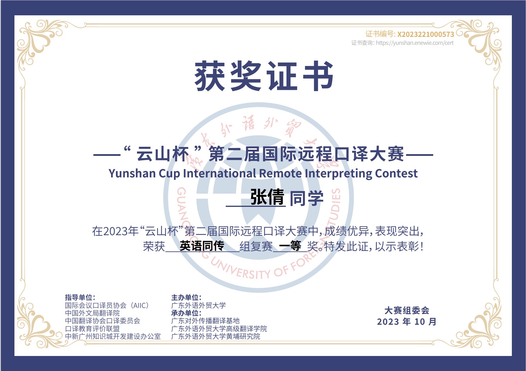 (通讯员:张倩)7月15日,第二届“云山杯”国际远程口译大赛如期举行。我校乐竞官网平台2021级MTI英语笔译方向研究生张倩经过一系列角逐,在英语交替传译初赛中荣获二等奖,英语同声传译初赛中荣获一等奖,并在9月23日举行的复赛中获得同声传译组一等奖,成功晋级决赛。