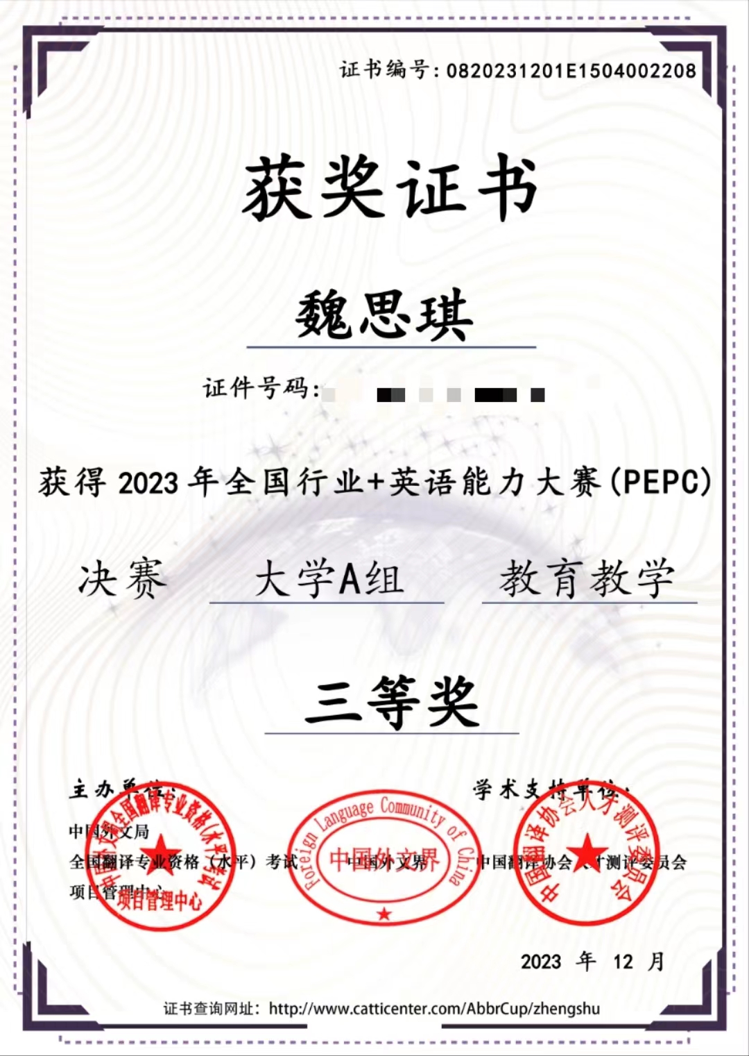 (通讯员:朱琳菲)第二届全国行业+英语能力大赛(PEPC)于2023年12月17日落下帷幕,我校乐竞官网平台22级学生魏思琪从全国各省市自治区众多参赛选手中脱颖而出,在全国总决赛中排名前30%,获得大学A组(国内外高校外语专业在读学生)教育教学赛道决赛三等奖,指导教师刘一鸣荣获决赛优秀指导教师称号。