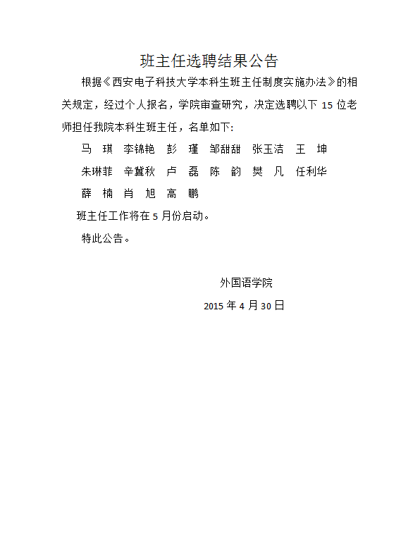 班主任选聘结果公告