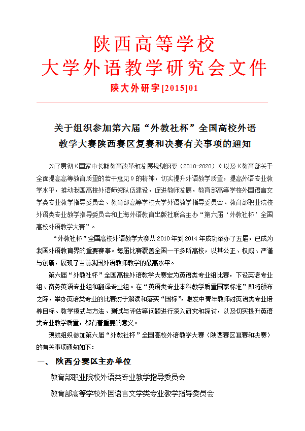 关于组织参加第六届“外教社杯”全国高校外语教学大赛陕西赛区复赛和决赛有关事项的通知