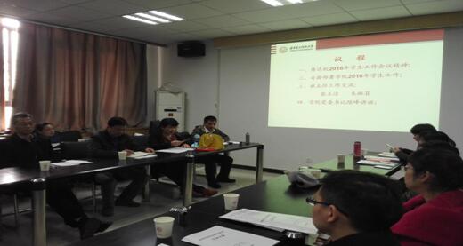 首先,独国社对上学期学生工作进行了总结回顾,随后传达了2016年学生工作会议精神,安排部署了学院2016年的学生工作,重点阐述了学院工作思路和工作计划,他希望,全体班主任、辅导员根据学校学院的工作安排,结合各班实际积极开展学风建设活动,近期要重点依据《关于学生在上课期间使用手机的管理规定》和《关于加强学生宿舍网络游戏管理的规定》,深入班级制订措施,加强与代课老师的联系,确保两项管理规定落到实处。