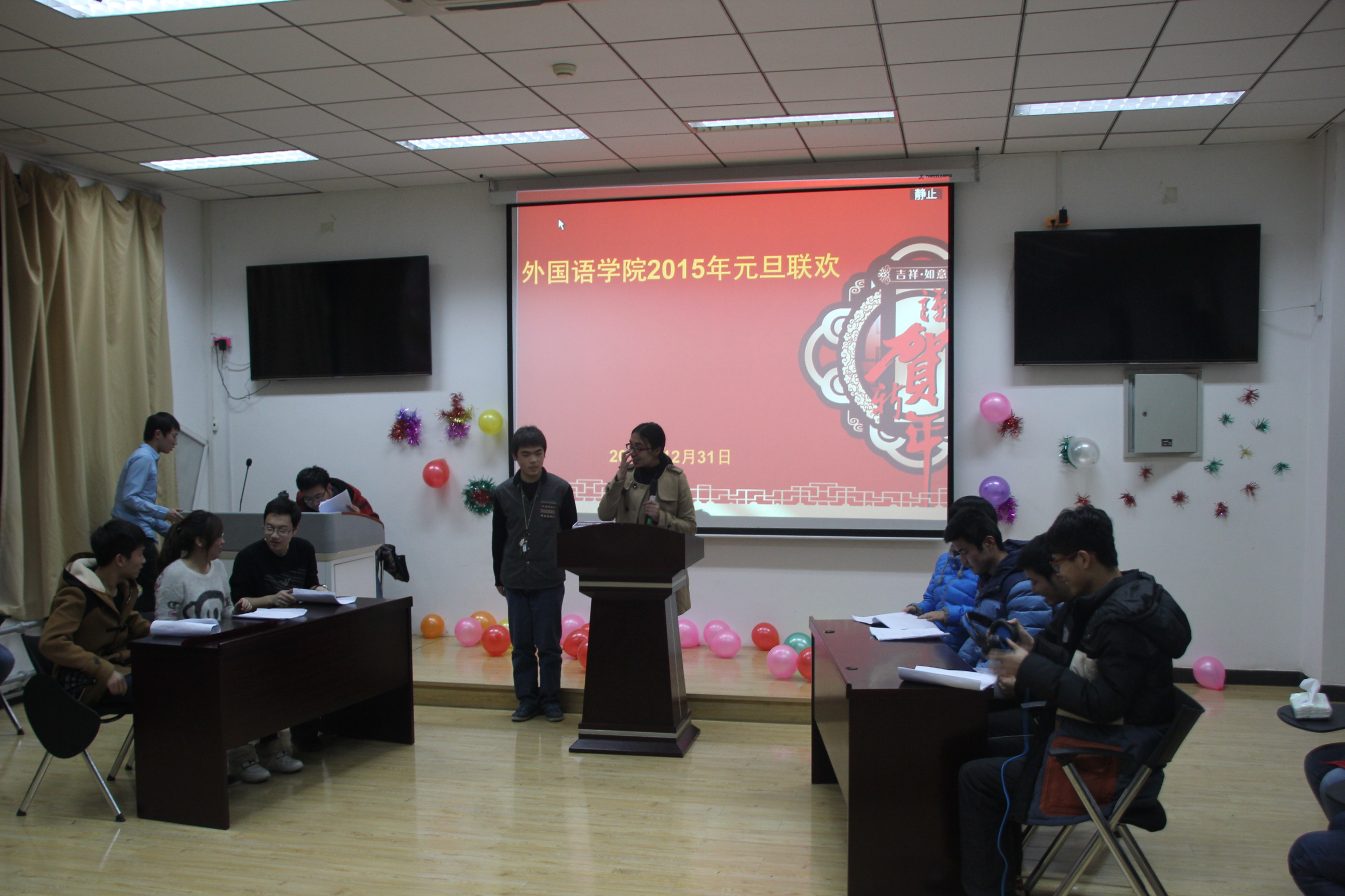 我院研究生向全体师生展示了他们庆贺新年,吃团圆饺子的视频,场面温馨,情谊浓浓。浓厚的新年味道随之弥散开来。独具特色的民族舞蹈带来了异域风情,激情四射的歌曲串烧让观众欢呼雀跃。幽默诙谐的情景剧《一个故事》将晚会推向高潮,经典情景辩论赛《在西电男生优秀还是女生优秀》逗得大家捧腹大笑,精彩纷呈的节目给2015年的到来,增添了浓墨重彩的一笔。最后,晚会在紧张刺激的抽奖活动中落下帷幕。