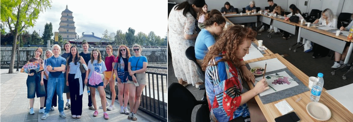 在接下来的文化课程中,德国学生还亲手体验书法、剪纸、中国画等传统艺术,学习中国传统“五步拳”,深刻感受中华文化的魅力。实地研学环节同样精彩,在秦始皇兵马俑博物馆,跨越千年的军阵肃穆庄严,令大家震撼不已;在大雁塔下,玄奘西行的故事传递着文明交流的永恒意义;在钟鼓楼广场,传统与现代交融的城市风貌,展现出西安古老而鲜活的城市品格。