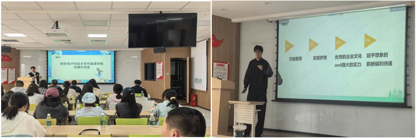 活动期间,新东方人力资源团队向师生们全面介绍了公司的发展历程、企业文化以及当下的人才招聘需求。新东方具有强大的应变能力,成功开辟 “东方甄选” 等新业务赛道,逐步发展成为集教育培训、产品研发、多元服务于一体的大型综合性教育科技集团,教育教学领域对英语专业学生有多元的人才需求。新东方积极求变的发展理念和雄厚的综合实力,得到了师生们的高度认可。
