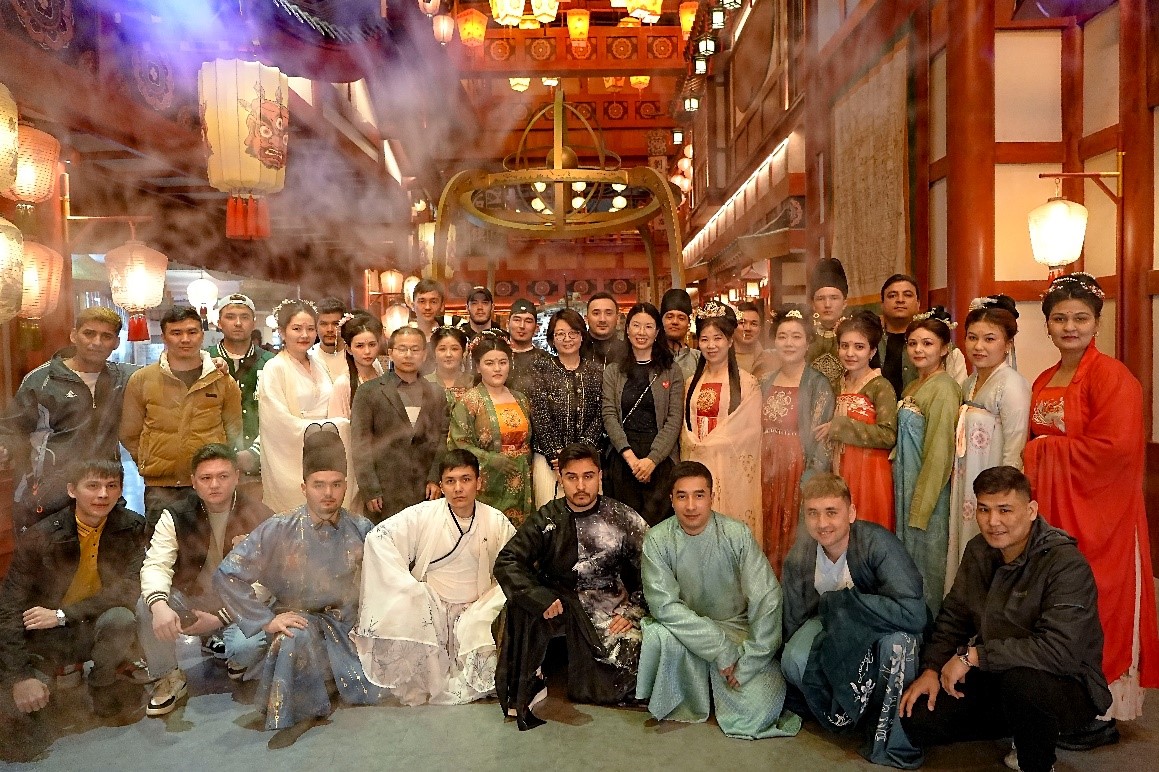 上午10时许,师生一行40余人来到位于西安大雁塔脚下的长安十二时辰主题街区。在观看完开市仪式之后,留学生们受街区氛围感染,纷纷换上唐服、画上唐妆,深度体验唐文化。在参观过程中,老师们结合街区主题背景,向留学生介绍唐代的美食、服饰、音乐、舞蹈、习俗、礼仪等方面的内容,把对外汉语和中国文化课堂搬到唐文化主题街区,留学生边学习边体验,达到了很好的实践教学效果。在胡姬酒肆,留学生们踊跃登台,与台上演员积极互动,学习新疆歌舞。在太白酒肆,留学生们详细了解李白的生平经历和文学成就,诵读李白的诗歌《静夜思》、《将进酒》。在上元安康踏歌台,留学生们在欣赏《霓裳羽衣舞》之余,积极参加现场问答和互动环节,学习唐代礼仪和中国古代文学知识。参观结束后,留学生纷纷表示,此次中国文化体验与汉语实践教学活动帮助大家学习到很多唐文化知识,并巩固了汉语与中国文化相关课程的课堂知识。