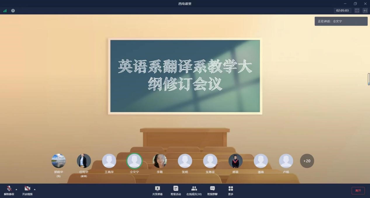 (通讯员:朱琳菲)6月30日下午,乐竞官网平台召开英语系、翻译系线上审核评估推进会暨教学大纲修订工作会,通报专业系部审核评估工作进展,总结本学期教学工作,部署并推进各门专业课程大纲修订工作。会议由英语系主任任利华主持,英语系、翻译系30余名教师参加会议。