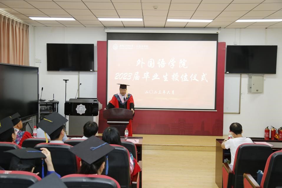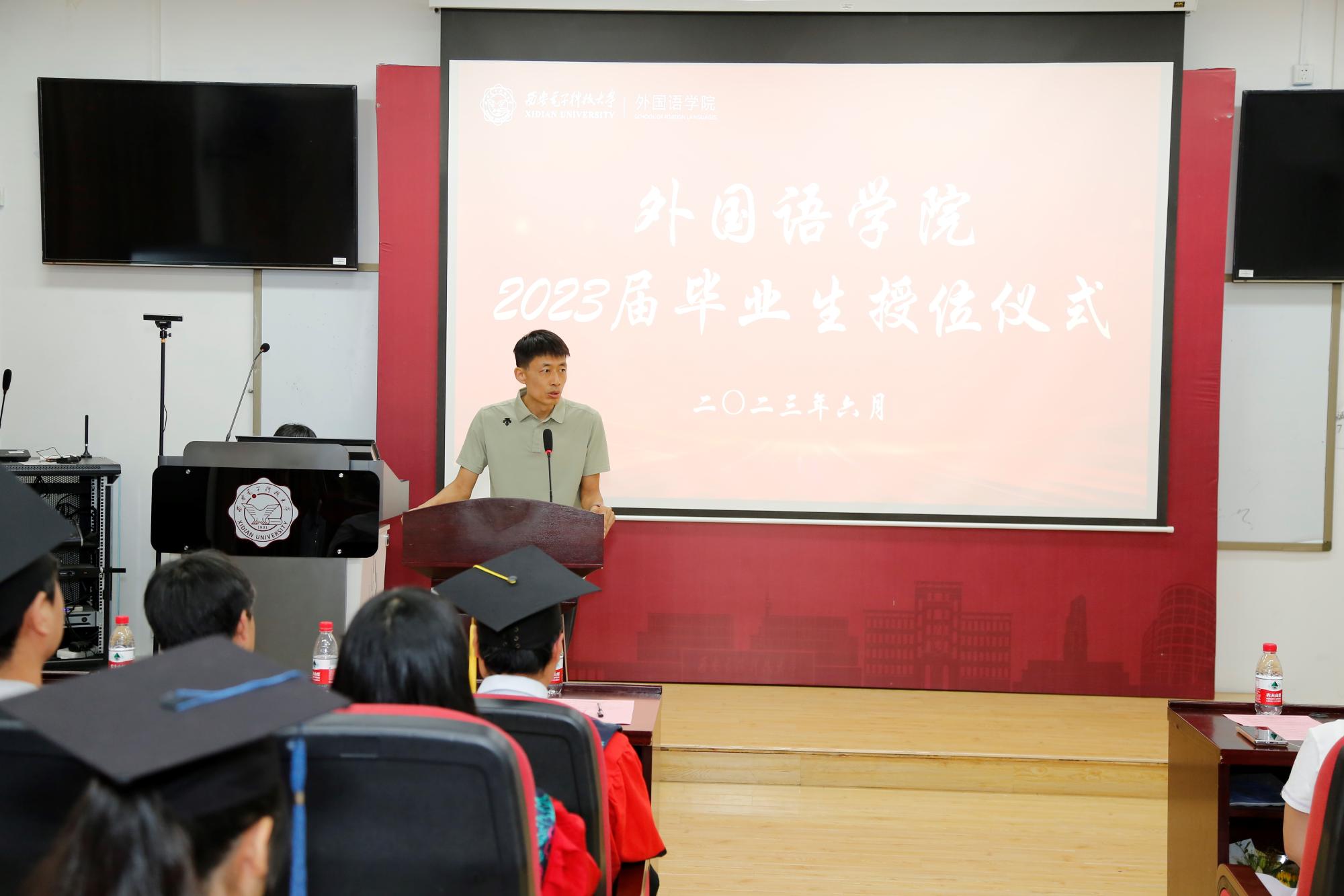 学院党委书记徐战利宣读授位决定,经西安电子科技大学学位评定委员会2023年6月21日审议,决定授予乐竞官网平台韩睿煜等14人文学硕士学位,张楷涓等23人翻译硕士学位,柳梦寒等79人文学学士学位。同时向各位毕业生及其家长表示祝贺,希望大家毕业后也能常回家看看。