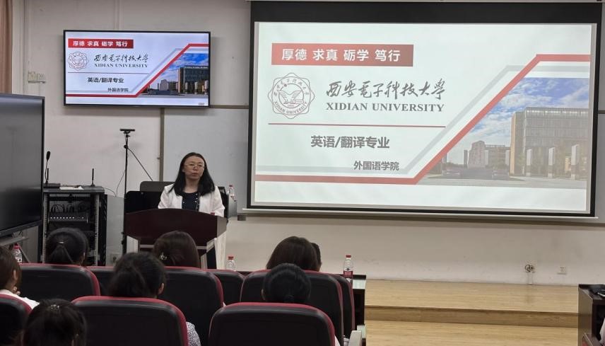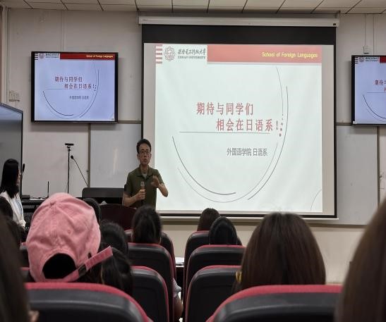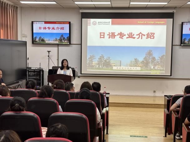 翻译系副主任乔卉娴向2023级新生详细讲解了英语类专业的课程设置,结合我校办学特点及行业背景,在课程设置和教学模式方面突出电子信息技术的专业特色,以培养高水平、高素质、高能力的外语人才为核心,进行复合型人才培养。
