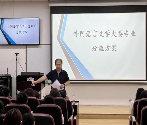 李长安针对外国语言文学大类分流工作进行了部署,他向同学们详细介绍了学院外国语言文学大类分流方案,指出分流工作以学校规章制度为指导,遵循自愿申请、尊重个性、分数优先的原则,注重公平、公开、公正,增强工作透明度,为分流工作指明方向,促进分流工作有序展开。