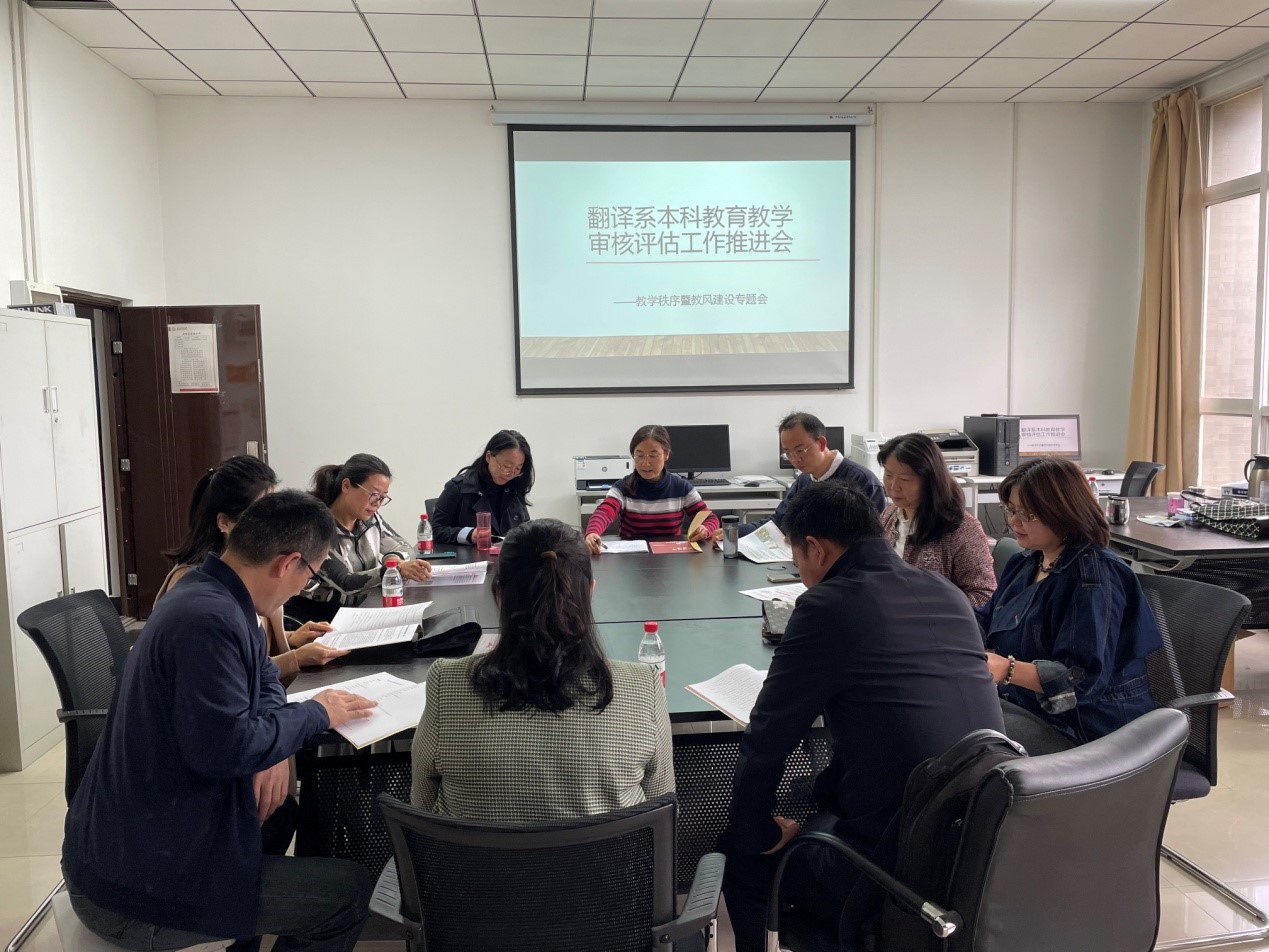 首先,仝文宁对翻译系本科教育教学审核评估进行冲刺动员。她从宏观和微观两个角度强调了本次审核评估的重要性、紧迫性和全面性,要求同志们众志成城做好迎评准备工作。