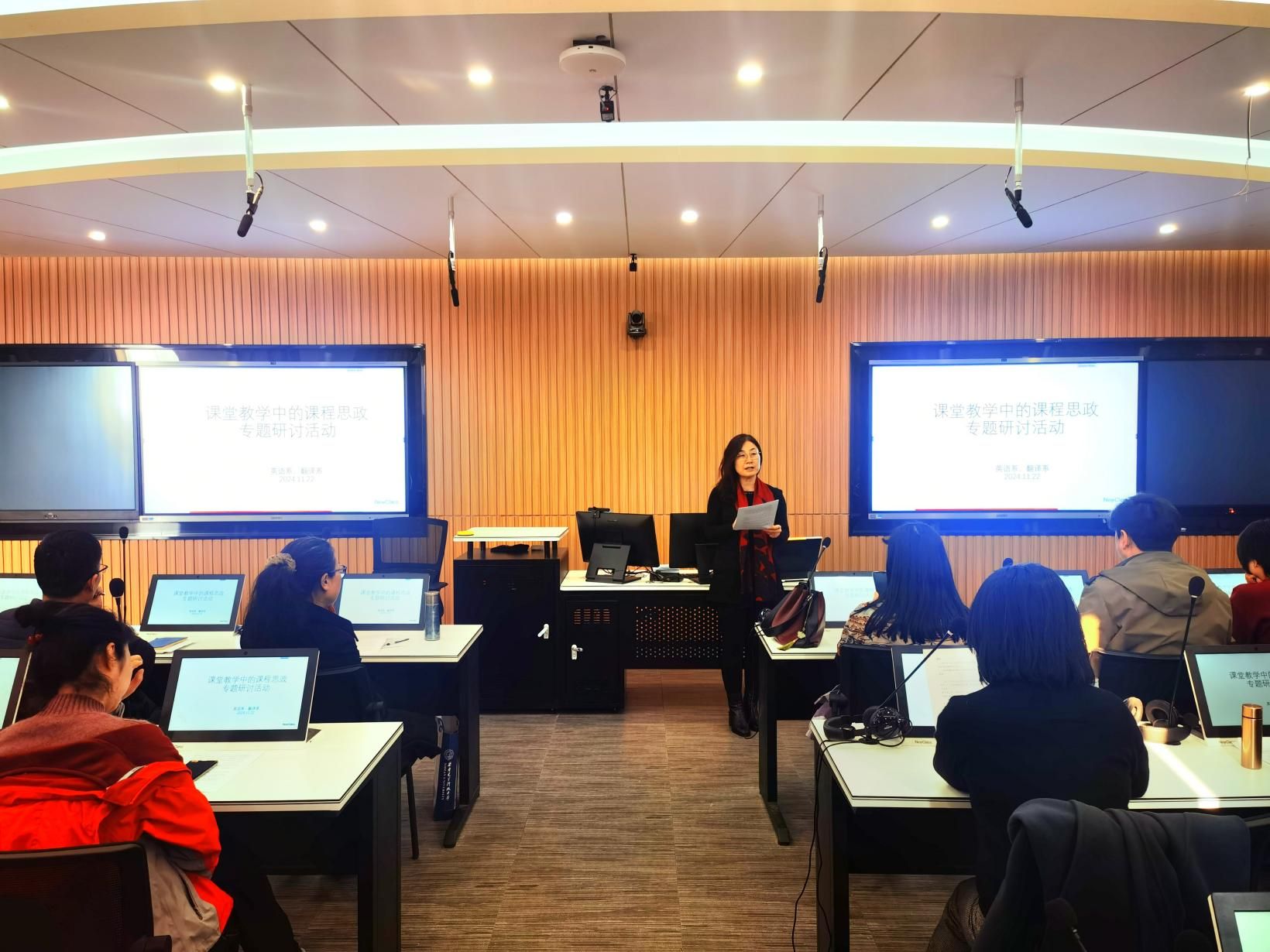 (通讯员:朱琳菲)英语系和翻译系11月22日在信远II区502举办《课堂教学中的课程思政》专题研讨活动,旨在深化课程思政教育与专业教学融合。活动由英语系主任主持,翻译系主任宣读学习文件,随后所有成员按课程组分组讨论,分享如何将思政教育融入各自课程。
